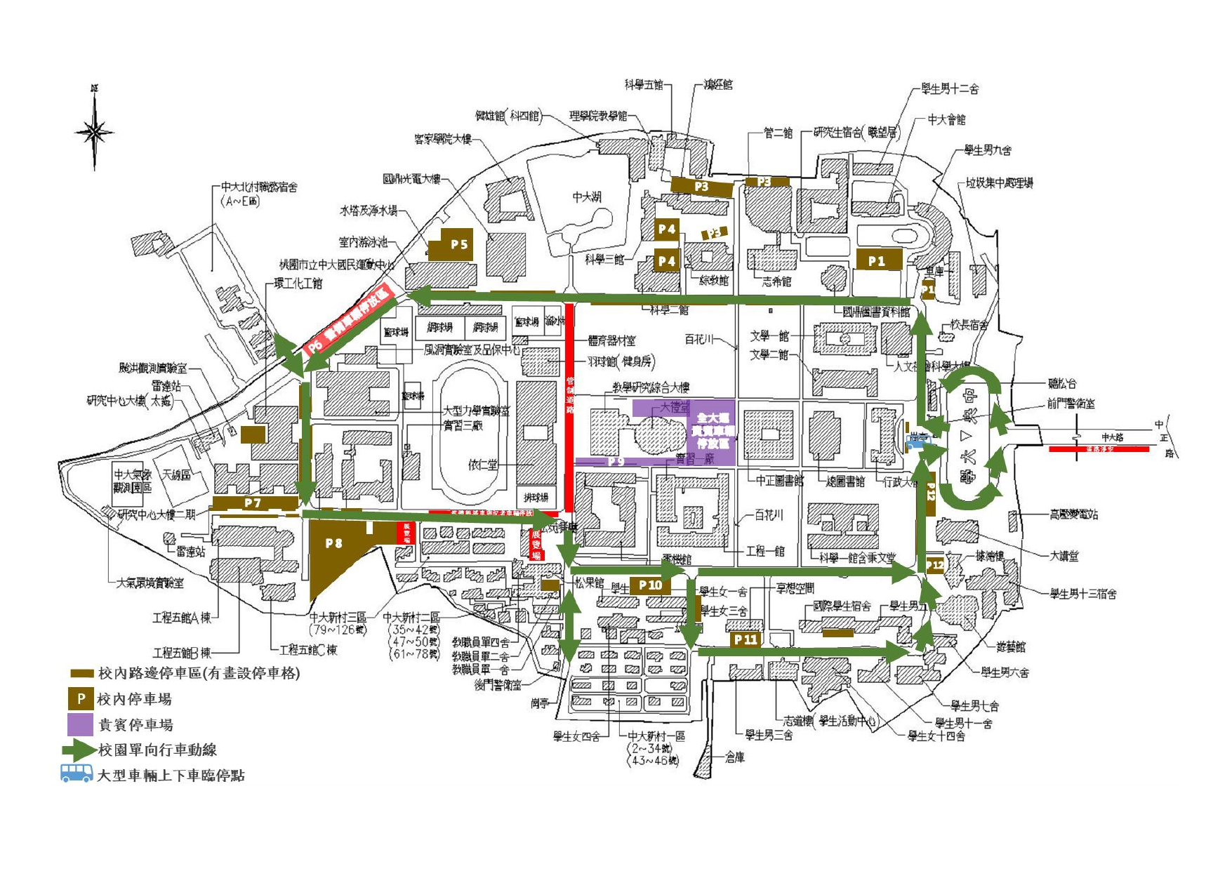• 行車方向:前門入校後一律往右轉單向行駛。